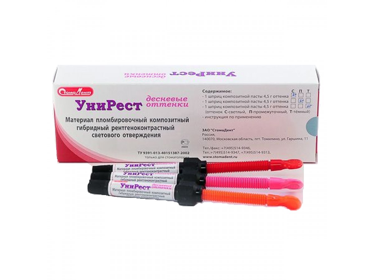 Унирест десневые оттенки - пломбировочный материал светового отверждения. Производитель: СтомаДент, Россия.