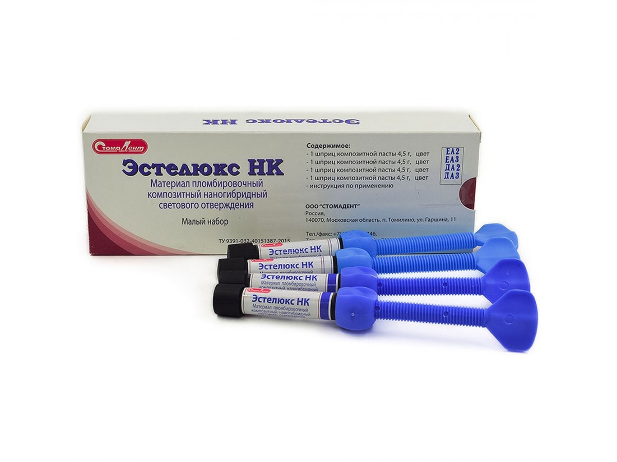 Малый набор Эстелюкс НК - композитный пломбировочный наногибридный материал светового отверждения с дисперсностью частиц от 0,04 мкн. Производитель: СтомаДент, Россия.