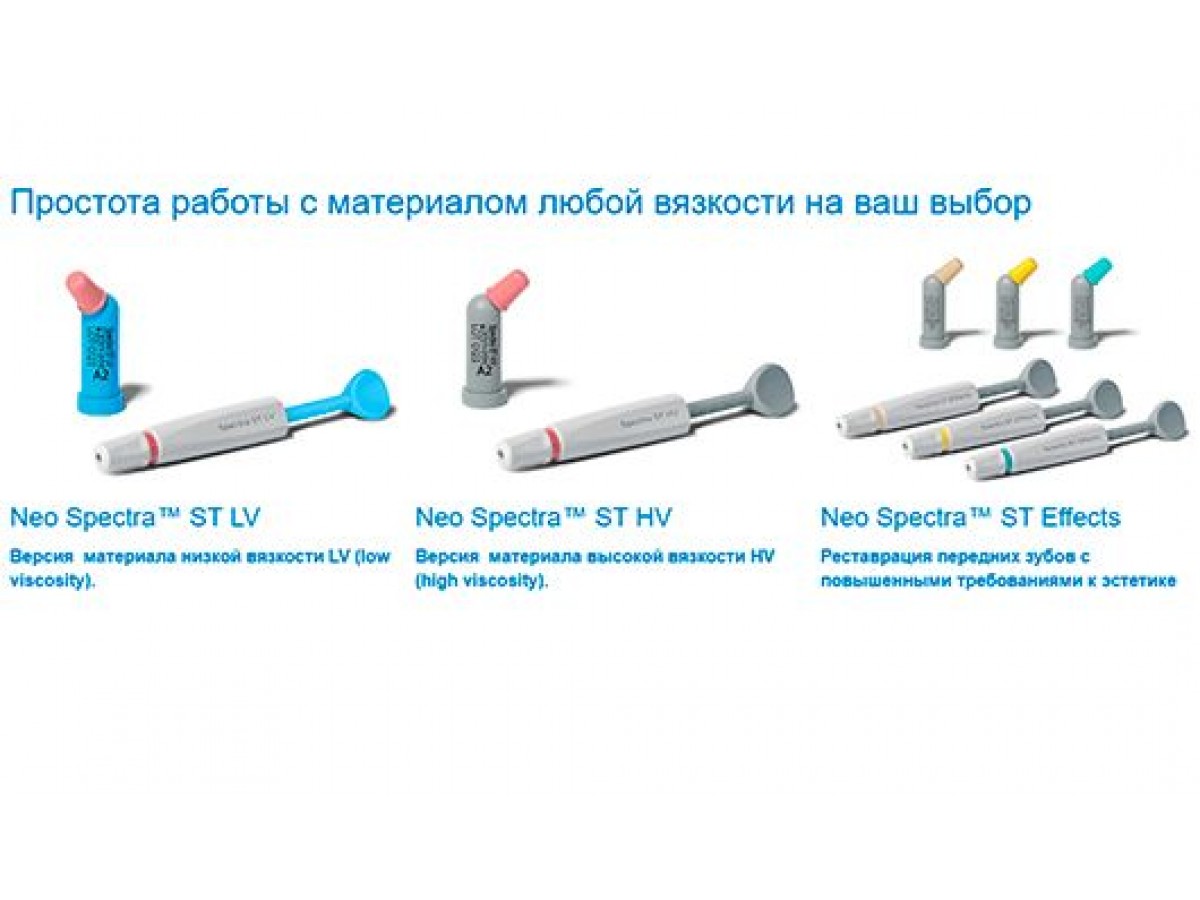 - Благодаря технологии наполнителя SphereTEC композитный материал Neo Spectra ST обладает улучшенными манипуляционными свойствами и предлагает 2 варианта вязкости: низкую (LV - low viscosity) и высокую (HV - high viscosity) вязкость, что позволяет ему соответствовать вашим предпочтениям и технике нанесения для эффективного и простого использования.