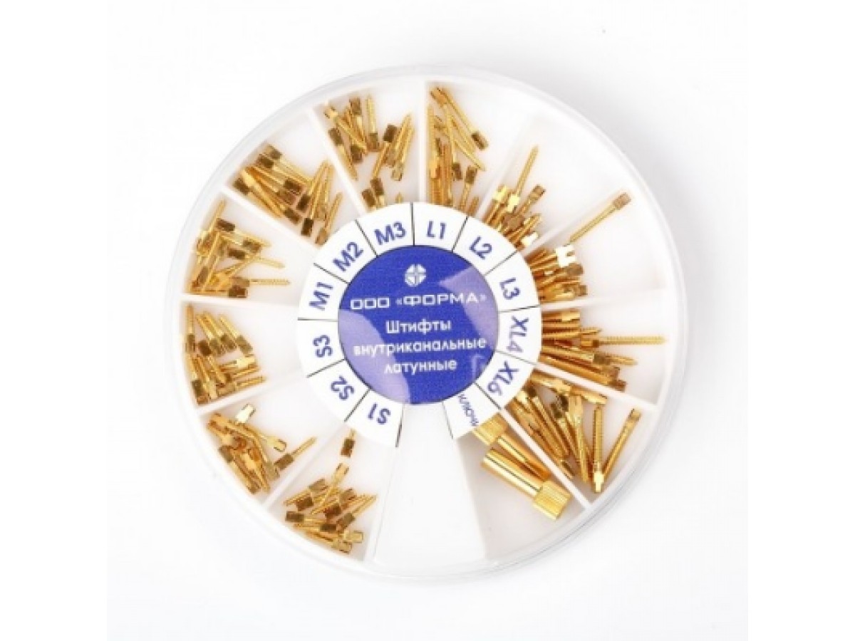 Штифты латунные (ШВП) - внутриканальные, анкерные штифты из позолоченной латуни. Штифты выполнены винтовыми с головкой под крестовой и внутренний ключ. При производстве используется покрытие золотом толщиной до 3 мкм. Производитель: Форма, РФ.