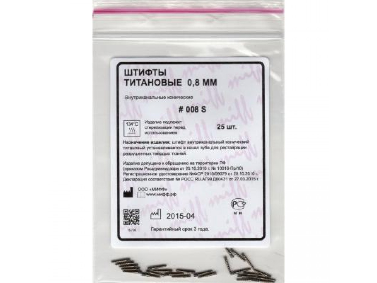 - Штифты титановые, размер 008S — 25 шт. в упаковке.