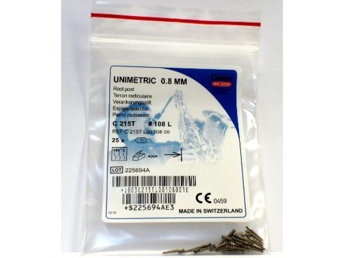 Штифты титановые Unimetric — это эндоканальные штифты из титанового сплава, применимые в эндодонтии в качестве армирующего элемента для восстановления частично разрушенной коронки зуба пломбировочным материалом. Производитель: Dentsply Maillefer Sirona, Швейцария.