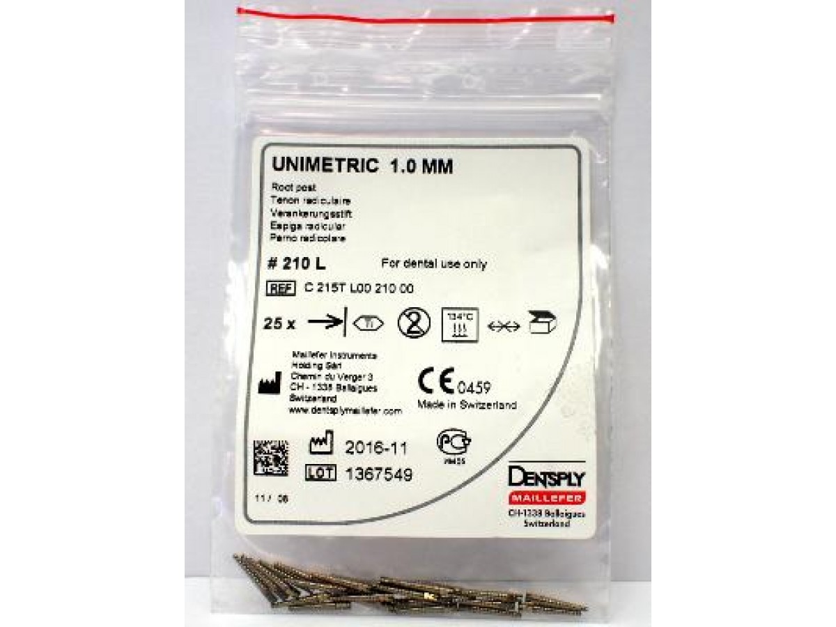 Штифты титановые Unimetric — это эндоканальные штифты из титанового сплава, применимые в эндодонтии в качестве армирующего элемента для восстановления частично разрушенной коронки зуба пломбировочным материалом. Производитель: Dentsply Maillefer Sirona, Швейцария.