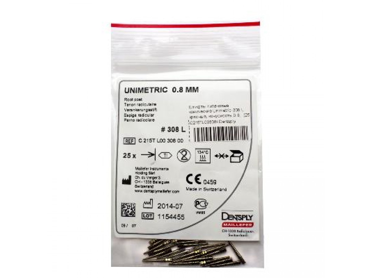 Штифты титановые Unimetric — это эндоканальные штифты из титанового сплава, применимые в эндодонтии в качестве армирующего элемента для восстановления частично разрушенной коронки зуба пломбировочным материалом. Производитель: Dentsply Maillefer Sirona, Швейцария.