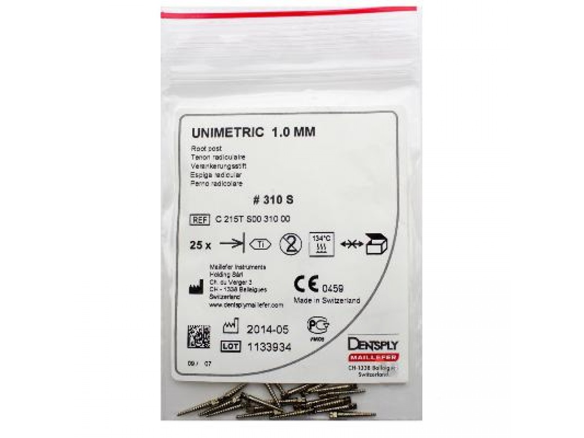 Штифты титановые Unimetric — это эндоканальные штифты из титанового сплава, применимые в эндодонтии в качестве армирующего элемента для восстановления частично разрушенной коронки зуба пломбировочным материалом. Производитель: Dentsply Maillefer Sirona, Швейцария.