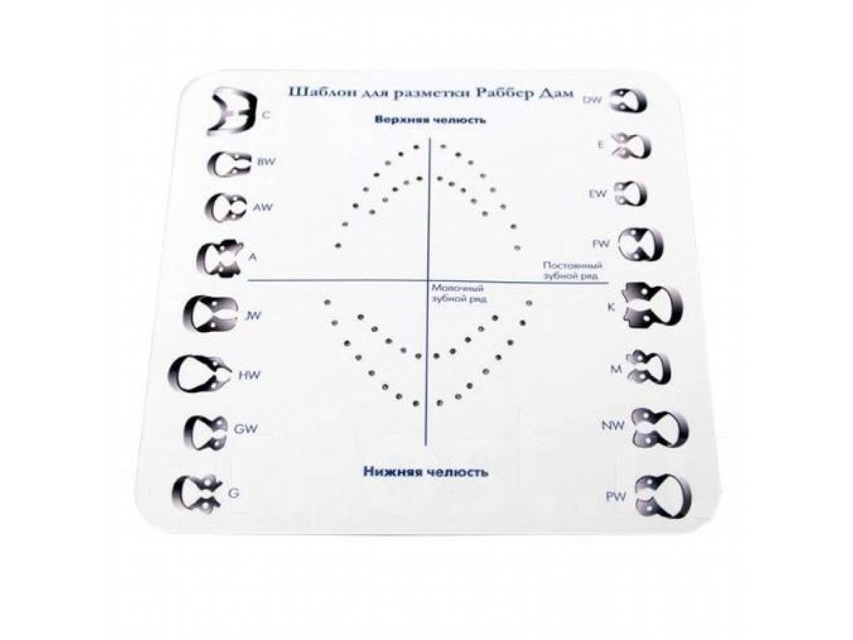 Шаблон для разметки Раббер Дам для осуществления предварительной разметки полотна под будущие отверстия. При перфорации латекса следует учитывать наличие аномалий или дефектов зубного ряда. Производитель: Medenta, Пакистан.