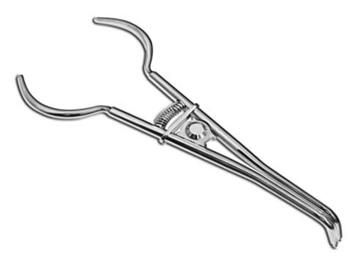 - Ретенционные шипы на щечках щипцов вводятся в отверстия на клампе, щипцы фиксируются в раздвинутом состоянии.