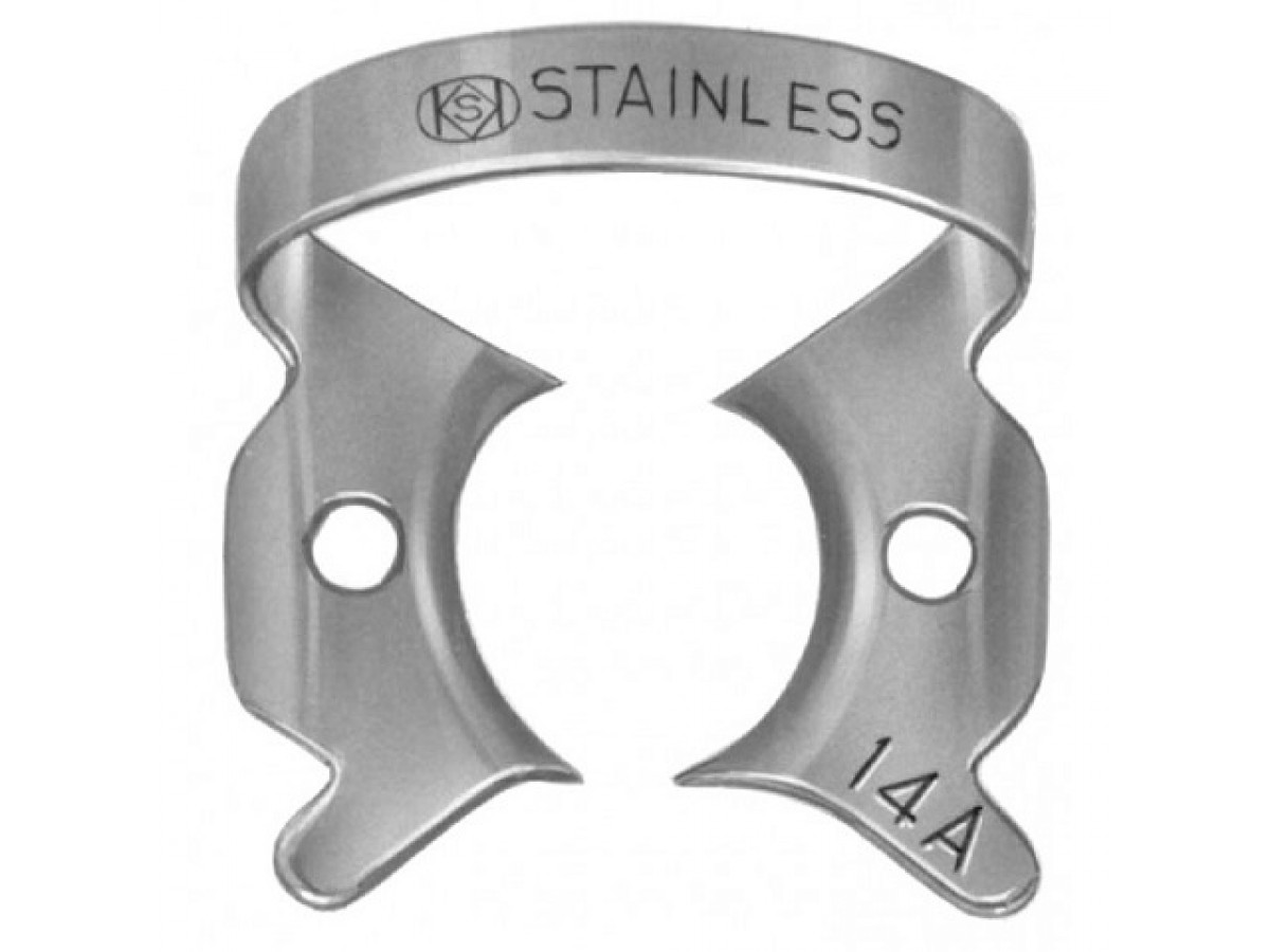 Кламп № 14А для частично прорезавшихся моляров верхней и нижней челюсти, а также для зубов, имеющих значительное разрушение коронковой части или полностью разрушенную мезиальную стенку. В отличие от клампа №14 имеет широкие щечки. Часто применяется для работы с кариозными поражениями твердых тканей зуба любой локализации и на зубах с коронковой частью большого размера. Производитель: Dentech, Япония.