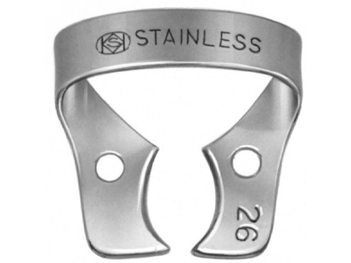 Кламп № 26 для моляров верхней и нижней челюсти. Крылья отсутствуют, среднего размера щечки вогнуты в апикальном направлении. Идеален как якорный кламп на зубы с коронковыми частями среднего размера. Возможна надежная фиксация на сильно разрушенные зубы с небольшой ретракцией краевой десны и десневых сосочков. Широкие щечки обеспечивают хороший обзор со всех сторон и не дают платку, при натяжении, приближаться к коронковой части зуба в момент ее препарирования ротационными инструментами. Производитель: Dentech, Япония.
