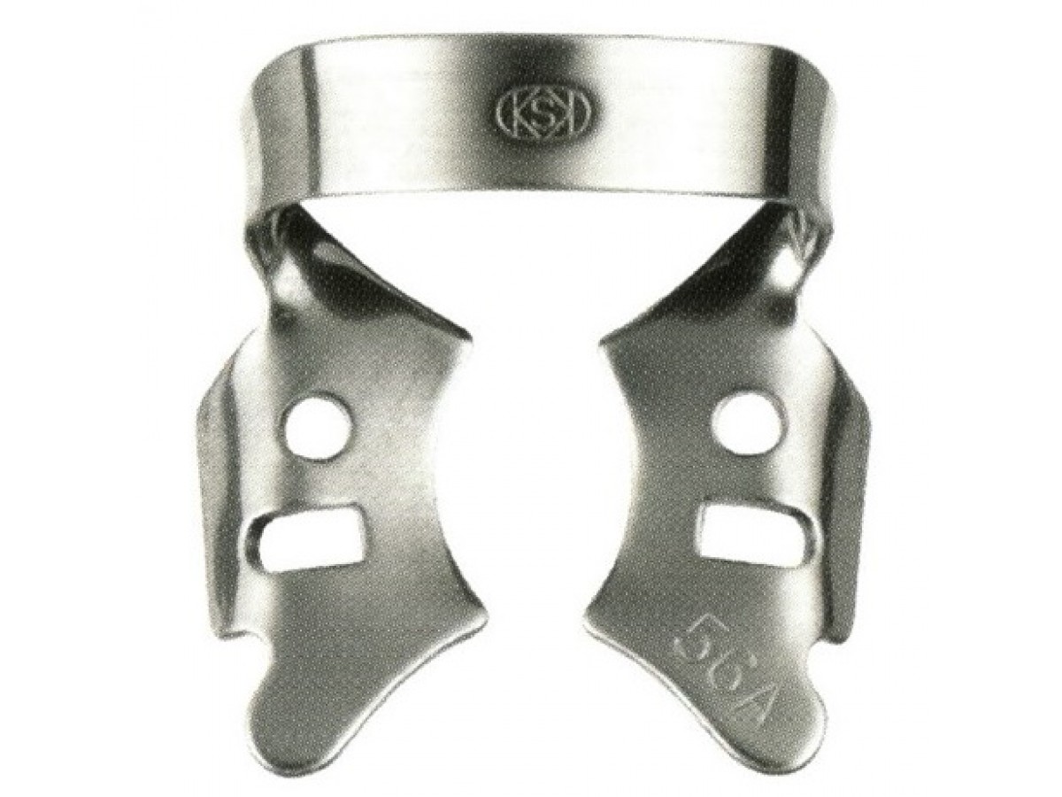 Кламп № 56A для моляров верхней и нижней челюсти. Имеет симметричные щечки большого радиуса для зубов с крупной коронковой частью. На боковых крыльях имеются дополнительные овальные отверстия, облегчающие снятие края перфорации латексного платка при установке. Производитель: Dentech, Япония.