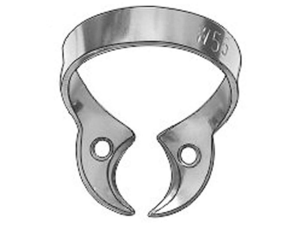 Кламп № W56 с жесткими изогнутыми "челюстями" (с глубоким захватом), без крыльев, для нижних моляров с большим размером коронки, используется в том числе при сильном разрушении коронки зуба. Производитель: ТОР ВМ, Россия.