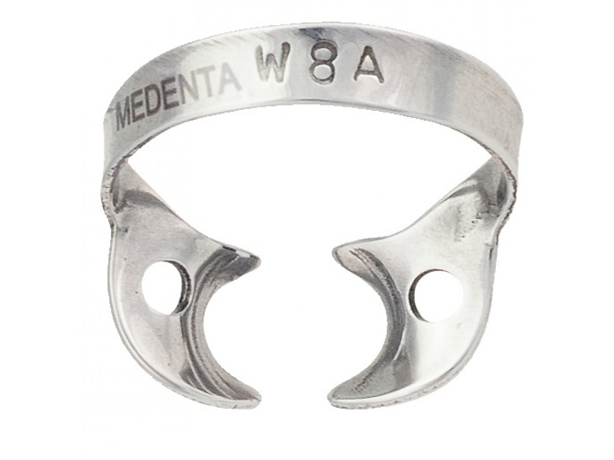 Кламп № W8A для верхних моляров с глубокими фестончатыми щечками для захвата под десной, без крыльев. Аналог Brinker B1. Производитель: Medenta, Пакистан.