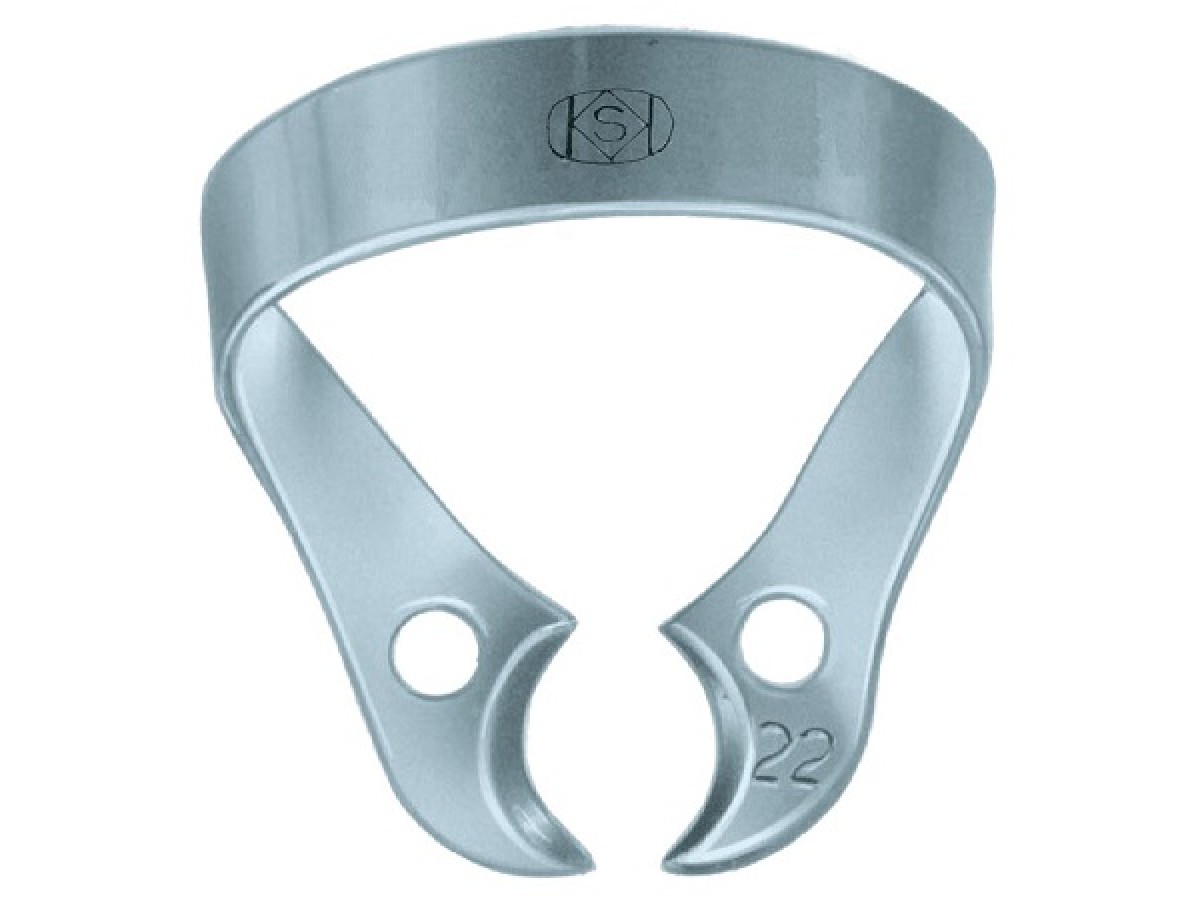 Кламп № 22 для клыков и премоляров верхней и нижней челюсти, для зубов с незначительными разрушениями коронковой части, сохраненной ферулой и выраженным экватором. Латеральные крылья отсутствуют. Он удобен при одевании перфорации латексного платка через кламп. Рекомендуется при протяженных двусторонних изоляциях фронтальных участков верхней и нижней челюсти, препарировании под несъемные ортопедические конструкции и их адгезивной фиксации, лечении множественного кариеса, фиксации ортодонтических ретейнеров, изоляции одиночных зубов для эндодонтического лечения. Производитель: Dentech, Япония.