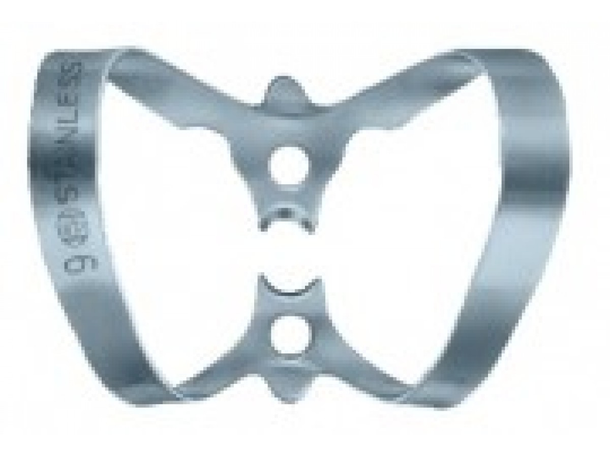 Кламп № 9 для коффердама "бабочка" для фронтальной группы зубов. Кламп «бабочка» с двумя дугами для резцов и клыков нижней челюсти. Щечки одного размера, имеются крылья для фиксации клампа в перфорации латексного платка при его одевании на опорные зубы. Кламп удобен при выполнении эндодонтического лечения, внутрикоронкового отбеливания и для фиксации ортопедических конструкций. Производитель: Dentech, Япония.