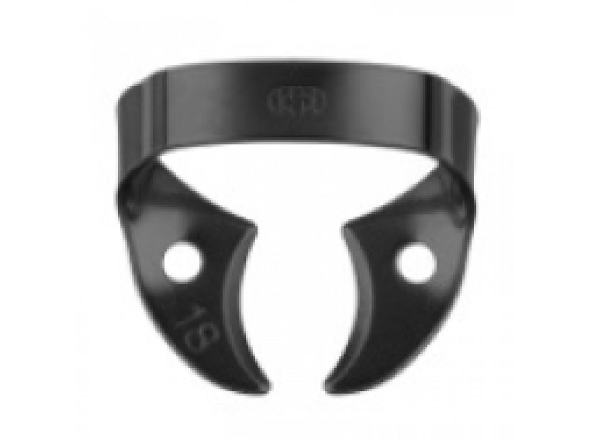 Кламп № 18-В для моляров верхней и нижней челюсти. Без крыльев. Наружные края щечек закруглены для большей компактности. Типичная область применения – как якорный кламп при протяженных участках изоляции. Также используется для адгезивной фиксации ортопедической конструкции, при эндодонтическом лечении, при дистопии зубов, небольших размерах коронковой части и средней выраженности экватора зуба. Производитель: Dentech, Япония.
