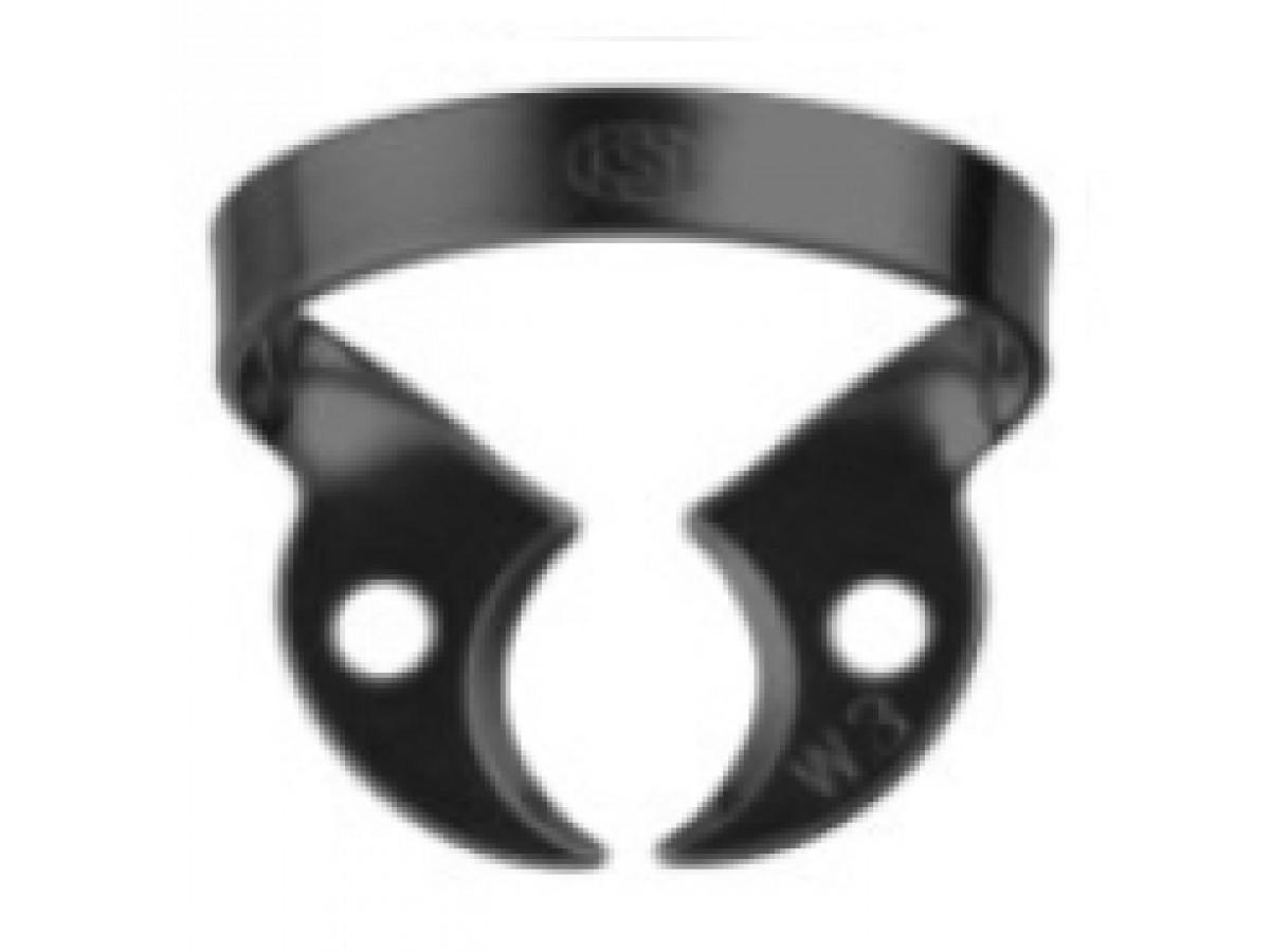 Кламп № W3-В для моляров небольшого размера, дистопированных из зубного ряда; для моляров верхней челюсти, иногда имеющих ромбовидную форму; для фиксации на восьмые зубы (зубы мудрости) при значительном дефиците пространства в латеральную сторону. Благодаря отсутствию крыльев он может быть предпочтительнее № 12А и № 13А. Производитель: Dentech, Япония.