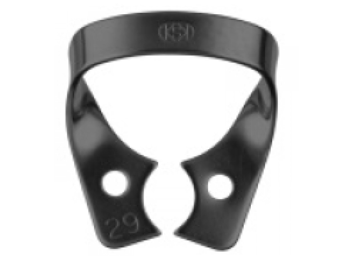 Кламп № 29-В для клыков и премоляров верхней и нижней челюсти, для зубов с сильно разрушенной или отсутствующей коронковой частью. Латеральные крылья отсутствуют. Вместо медиальных крыльев - небольшие углы, служащие для отодвигания платка и его защиты от ротационного инструмента. В отличие от клампа №27, имеет более широкие щёчки и меньший радиус дуги, что обеспечивает более надёжную фиксацию клампа на опорном зубе. Кламп также можно использовать как якорный, при протяженных двусторонних изоляциях фронтальных участков верхней и нижней челюсти. Производитель: Dentech, Япония.