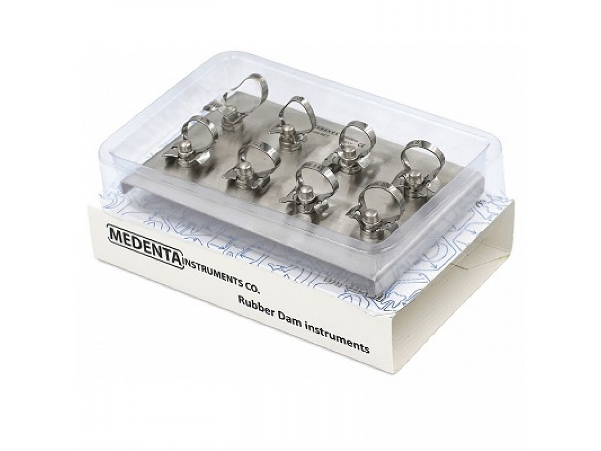 Комплект кламмеров Раббер Дам Set TiAlN - состоит из стальных креплений для различных групп зубов и подставки. Производитель: Medenta Instrumets Co., Пакистан.