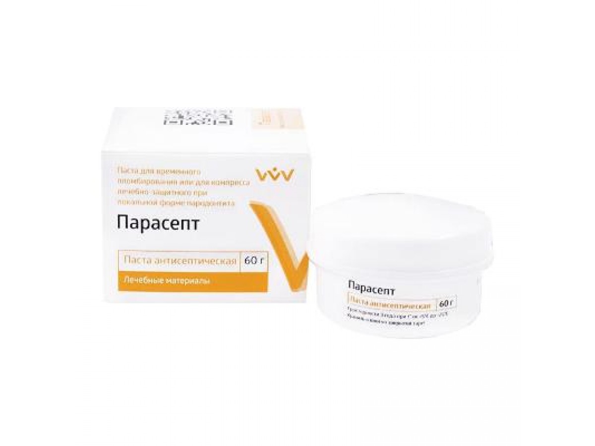 Парасепт - это пластичная самотвердеющая паста, cодержащая волокна в своей массе, приготовлена на основе порошка цинксульфатного цемента, не содержит эвгенола. Обладает антибактериальными и противовоспалительными свойствами. Производитель: Владмива, РФ.