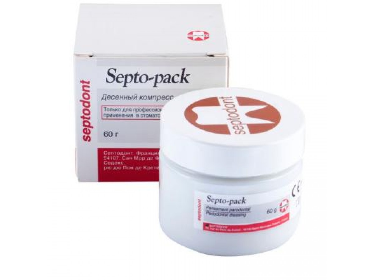 Septo-pack - это паста, плотный десенный компресс, временный дентин, плотная защитная повязка для десен. В качестве нейтральной основы эта паста также может быть использована вместе с некоторыми лекарственными препаратами, способствуя удержанию их на месте на уровне десны, зуба или альвеолы. Производитель: Septodont, Франция.