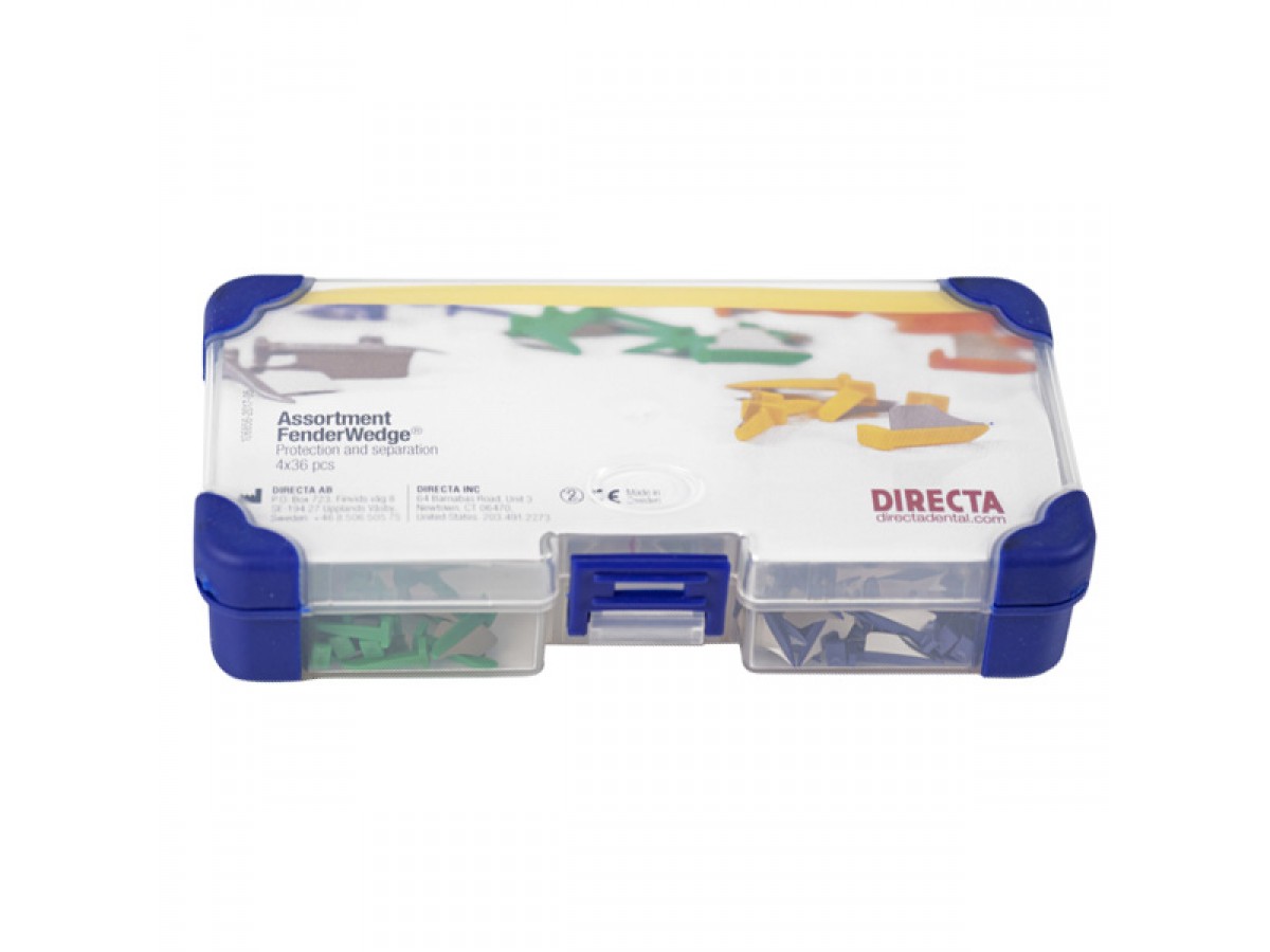 FenderWedge Kit – набор пластмассовых межзубных клиньев с вертикальной стальной полоской (толщиной 0,08 мм), которая защищает рядом стоящий зуб, и в то же время сепарирует зубы для оптимального восстановления контактного пункта. Клинья выпускаются в 4 размерах по ширине межзубного клина. Имеют цветовую кодировку для простоты идентификации. Производитель: Directa AB, Швеция.