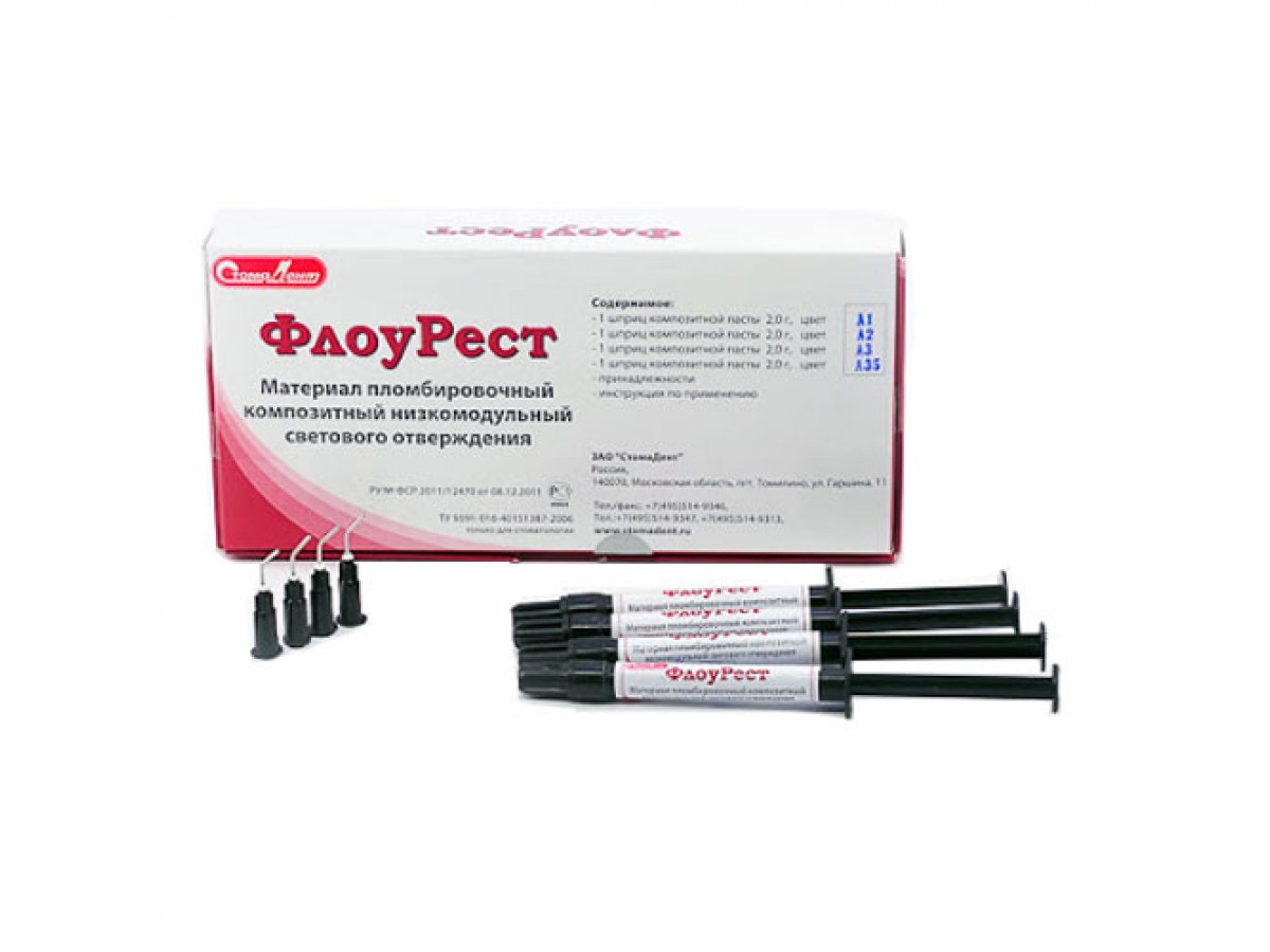 ФлоуРест набор - текучий (низкомодульный) композитный пломбировочный материал светового отверждения. Производитель: СтомаДент, Россия.