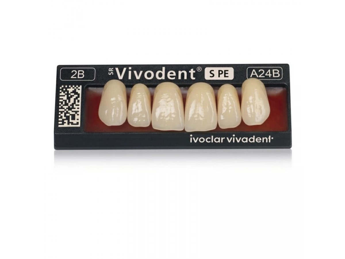 Передние зубы SR Vivodent PE демонстрируют высокую степень прочности, плотности, устойчивости к растворителям и цветостойкость. Они особенно подходят для полных съемных зубных протезов. Производитель: Ivoclar Vivadent, Филиппины.