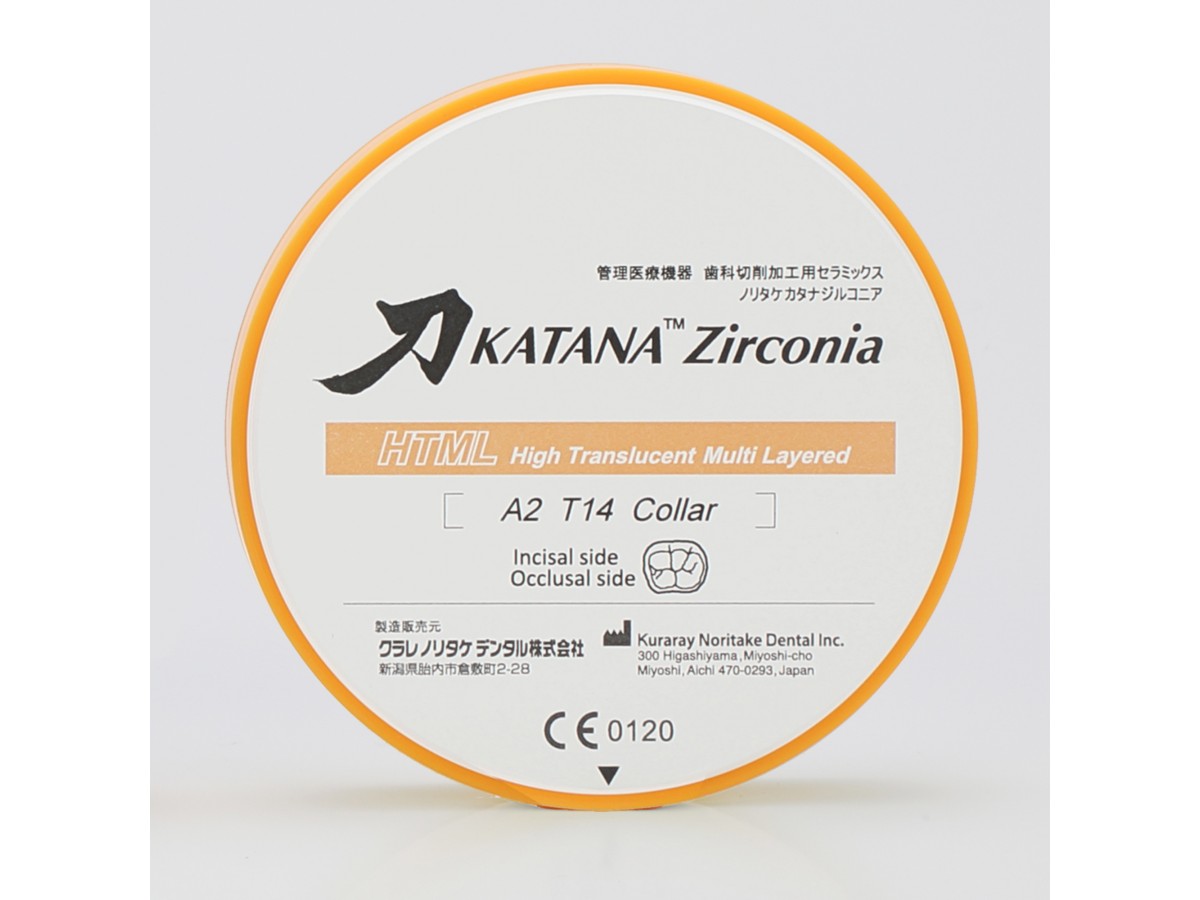 KATANA Zirconia HTML – Многослойные циркониевые диски из предокрашенного циркона с плавным переходом цвета от пришеечной области к дентину и затем к эмали. Производитель: Kuraray Noritake Dental Inc., Япония.