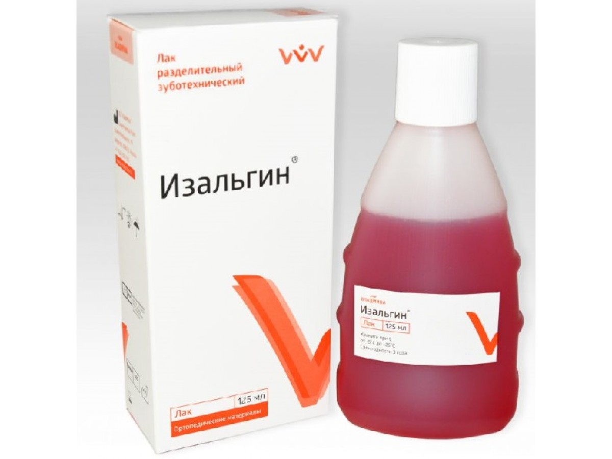 Изальгин - предназначен для применения в стоматологической практике в качестве изоляционного материала при изготовлении пластмассовых протезов и гипсовых форм. Производитель: ВладМиВа, Россия.