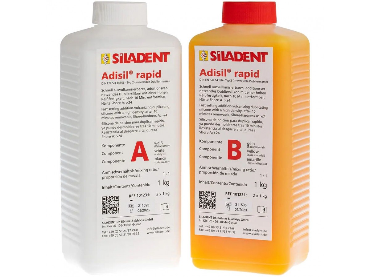 Силикон дополнительного отверждения Adisil Rapid разработан специально для быстрого дублирования моделей при использовании кювет и в бескюветной технике дублирования Siladent. Adisil rapid можно отделять от модели уже через 10 минут после заполнения. Производитель: Siladent, Германия.
