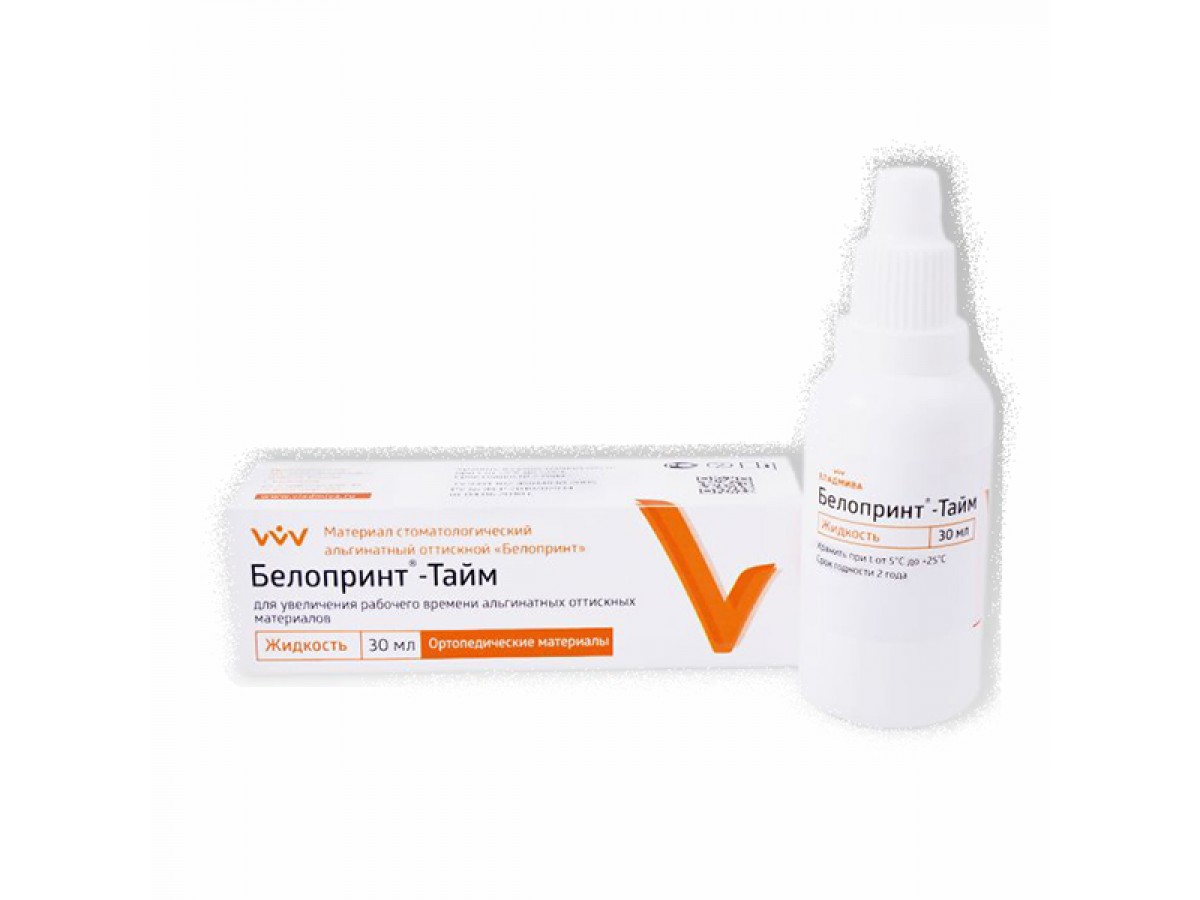 - Жидкость «Белопринт»-тайм содержит компонент, замедляющий начало структурирования альгинатного материала, при этом его физические свойства – прочность, эластичность, остаются без изменения. «Белопринт»-тайм не влияет на минимальное время пребывания материала в полости рта.