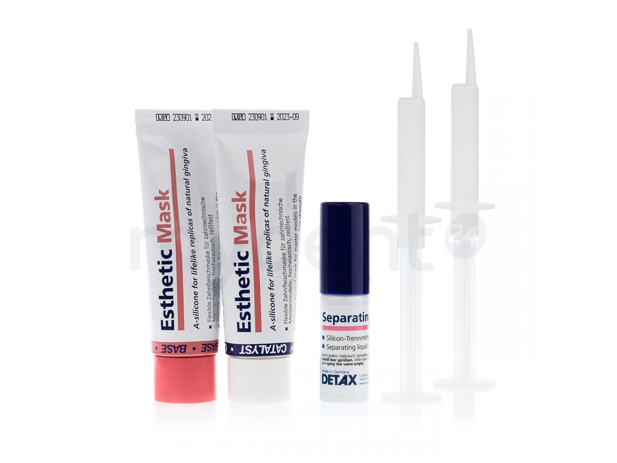 Мягкая десневая маска Esthetic Mask на основе А-силикона предназначается для изготовления зуботехнических мастер-моделей и разборных моделей, холодного отверждения, размеростабильная, особо эластичная и особенно прочная. Легко и быстро обрабатывается, твердость по Шору примерно 45 А. Для ручного сменивания, пропорции смеси 1:1, со шприцами многократного пользования. Для оптически естественной, эстетичной десны.