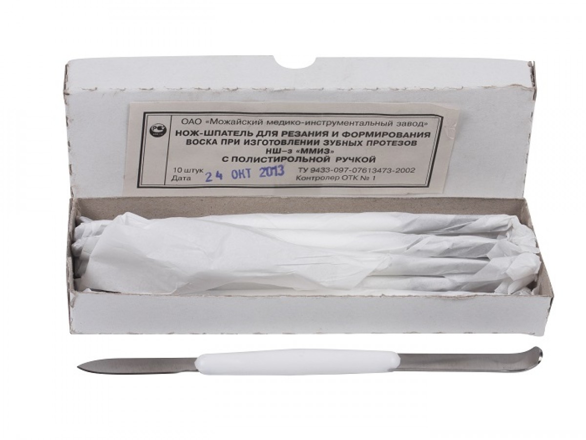 Нож-шпатель зуботехнический с пластиковой ручкой - применяется в изготовлении протезов зубов. Производитель: Можайский МИЗ, Россия.